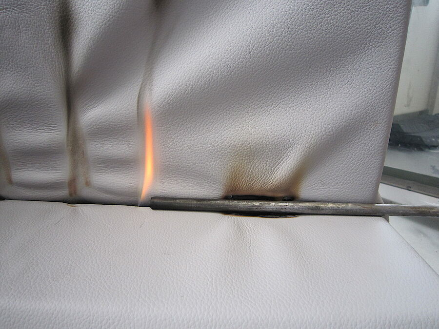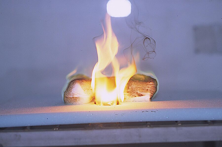 - Durchschnittliche Länge der Verkohlung über 150 mm bei einem Los von 5 Probekörpern durch Anbringen der Flamme am Rand oder an der Oberfläche.