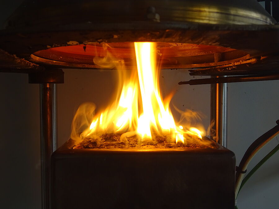 Ein brennendes Streichholz oder eine flackernde Kerze wird an Hand einer Propangasflamme simuliert, die von oben auf den Prüfgegenstand gelegt wird.