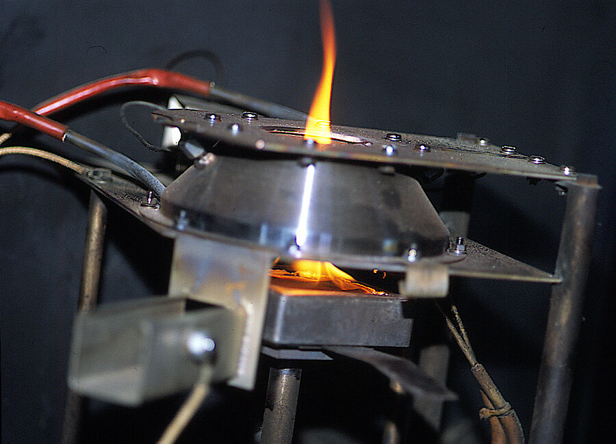 Es erfolgt eine Flächenbeflammung des Materials über 5 bzw. 15 Sekunden. Ist bei dieser Prüfanordnung kein anhaltendes Brennen zu erkennen, wird eine Kantenbeflammung über 5 bzw. 15 Sekunden des Materials durchgeführt.